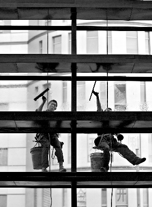 在第一家保潔公司,他認(rèn)識(shí)了“高空作業(yè)”:一根繩、一個(gè)桶,主要是和廣告牌打交道。沒有“蜘蛛人”這么時(shí)髦的叫法,那時(shí)都叫爬墻工。
