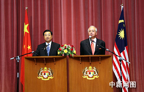會談結(jié)束后,胡錦濤和納吉布出席兩國合作文件簽字儀式并共同會見記者。中午,胡錦濤出席納吉布舉行的午宴。