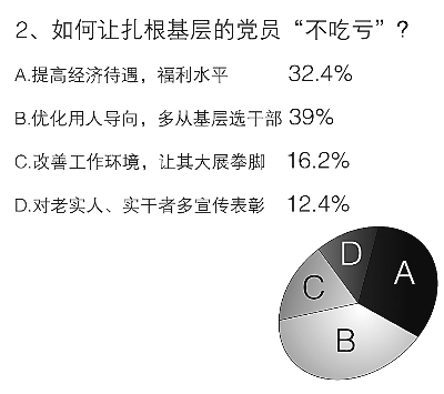 基層比較艱苦,基層比較復(fù)雜,被問到“如何讓扎根基層的共產(chǎn)黨員‘吃苦不吃虧’?”時,39%的受訪者更關(guān)注用人導(dǎo)向問題,他們認(rèn)為應(yīng)該優(yōu)化用人導(dǎo)向,多從基層選拔領(lǐng)導(dǎo)干部;選擇提高經(jīng)濟(jì)待遇,福利水平的也占到了32.4%;值得注意的是,“更重視基層,改善工作環(huán)境,讓其大展拳腳”也受到關(guān)注,有16.2%的受訪者選擇了該選項(xiàng)。