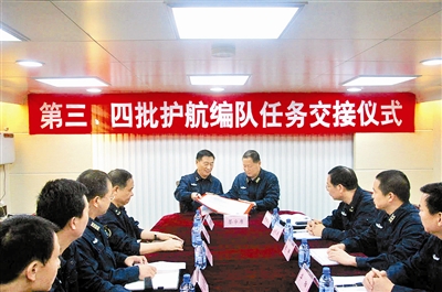 根據(jù)海軍部署,從當(dāng)?shù)貢r(shí)間11月27日1時(shí)開始,中國(guó)海軍第四批護(hù)航編隊(duì)正式接替第三批護(hù)航編隊(duì)擔(dān)負(fù)亞丁灣、索馬里海域護(hù)航任務(wù),“千島湖”艦轉(zhuǎn)隸第四批護(hù)航編隊(duì)指揮。交接過(guò)程按照編隊(duì)指揮組、政工組、后勤組、裝備組的順序組織實(shí)施。第三批護(hù)航編隊(duì)將相關(guān)文件、物資、器材和備品配件移交給第四批護(hù)航編隊(duì)。第三批護(hù)航編隊(duì)指揮員、東海艦隊(duì)副司令員王志國(guó)和第四批護(hù)航編隊(duì)指揮員、東海艦隊(duì)副參謀長(zhǎng)邱延鵬在任務(wù)交接書上簽字。