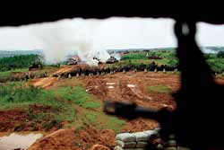演習進入實彈戰(zhàn)術階段,紅方坦克在彌漫的硝煙中沖鋒陷陣、動中組網(wǎng)、火力突擊;空中,武裝直升機從看臺西側穿云破霧,呼嘯而來,時而低空突擊,時而拉起、俯沖,數(shù)發(fā)炮彈拖著長長的火焰直射藍方陣地,藍方數(shù)輛坦克趴窩,多個火力點瞬間開花……