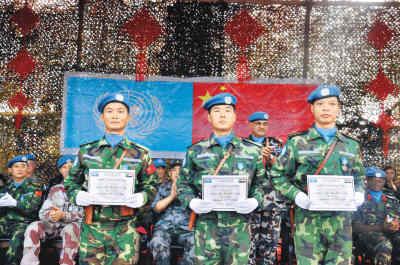 在國際維和戰(zhàn)場上,中國維和軍人還充當(dāng)了“文化使者”。在蘇丹,維和軍人長期把紅燈籠、中國結(jié)、四大發(fā)明和文房四寶的招貼畫等放在營區(qū)展示,還利用國慶招待會、新春招待會、授勛、迎奧運多國運動會等時機,播放反映中國人文風(fēng)情、改革開放成果的宣傳片。