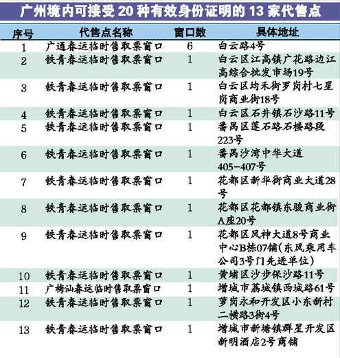 持除二代居民身份證以外的19種有效身份證件購票,在鐵路部門設(shè)立的集中售取票點(diǎn)、車站售票窗口以及廣東境內(nèi)的79家代售點(diǎn)可以購買實(shí)名制車票,記者了解到,其中廣州有13家這樣的代售點(diǎn),大部分分布在白云區(qū)、番禺區(qū)、花都區(qū),其他代售點(diǎn)可以辦理二代身份證購買實(shí)名制火車票。