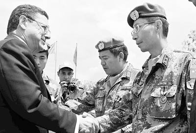 當(dāng)?shù)貢r(shí)間昨天中午,中國第十批赴剛果(金)維和醫(yī)療、工兵分隊(duì)聯(lián)合舉行盛大儀式接受聯(lián)剛團(tuán)授勛。聯(lián)剛團(tuán)最高官員、聯(lián)合國秘書長潘基文特別代表阿蘭多斯專程從金沙薩趕到布卡武的中國半島,親手為中國維和官兵頒授聯(lián)合國和平勛章。據(jù)悉,這種聯(lián)剛團(tuán)最高規(guī)格的授勛儀式,在布卡武任務(wù)區(qū)各國維和分隊(duì)中尚屬首次。中國駐剛果(金)大使吳澤獻(xiàn)和武官畢京三也從剛果(金)首都趕來參加這一儀式。