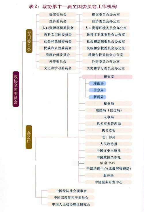 全國(guó)委員會(huì)設(shè)辦公廳,在秘書(shū)長(zhǎng)領(lǐng)導(dǎo)下進(jìn)行工作;設(shè)副秘書(shū)長(zhǎng)若干人,協(xié)助秘書(shū)長(zhǎng)進(jìn)行工作。政協(xié)第十一屆全國(guó)委員會(huì)工作機(jī)構(gòu)如表2。