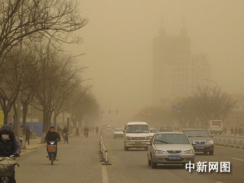 中新網(wǎng)廊坊3月20日電 (記者 宋敏濤)今晨,河北大部及京津地區(qū)出現(xiàn)明顯揚塵。有著“花園城市,溫馨之都”美譽的河北廊坊也難能幸免沙塵襲擊。今天上午,在廊坊街頭,受沙塵影響能見度不足千米。停了一晚的汽車上落滿一層黃色塵土,街上行人遮鼻掩口艱難前行。