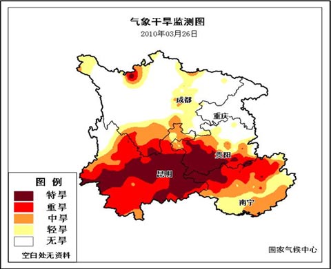 3月26日氣象干旱監(jiān)測顯示,云南大部、貴州西部和南部、廣西西部和北部、川西高原南部等地存在中度以上氣象干旱;其中云南大部、貴州西南部、廣西西北部、川西高原南部等地存在重度以上氣象干旱。