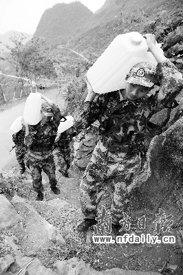 告別巖門屯許大媽家時(shí),已是中午1時(shí)多,官兵們顧不上吃午飯,拎著空桶又急匆匆向山下走去,他們要在就近的山澗采集清泉,為給下一個(gè)村的老百姓送水爭取時(shí)間……(南方日報(bào)特派記者洪奕宜 通訊員李三紅 發(fā)自廣西百色)