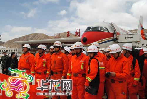經(jīng)過一個(gè)多小時(shí)的飛行,首批120名赴青海玉樹地震災(zāi)區(qū)參加抗震救災(zāi)的重慶救援隊(duì)隊(duì)員,于2010年4月15日14時(shí)45分,順利飛抵玉樹機(jī)場(chǎng)。
