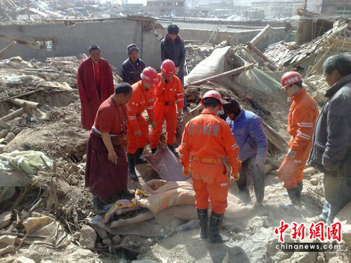 救援隊到達后玉樹縣后,首先趕到結(jié)古鎮(zhèn)“玉樹州綜合民族職業(yè)學!笨逅F(xiàn)場,并立即展開搜救。據(jù)了解,該職業(yè)中學的三層電教樓全部垮塌,下面還有10余名學生被埋。什邡市安全生產(chǎn)應急救援大隊搶險隊員運用專業(yè)工具馬上進行施救。經(jīng)過一夜緊張救援,被埋壓在職業(yè)學校電教大樓下的6名學生遺體被挖出,搜救仍在繼續(xù)。