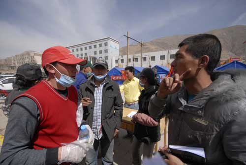 他的名字叫高樹友。在現(xiàn)場負責招募志愿者的玉樹團州委干事扎西告訴我,地震發(fā)生后幾小時,滿身是土的高樹友跑來了,找到我們要求當志愿者!爱敃r現(xiàn)場還很亂,我們隨便找了一張紙,高樹友寫下了第一個名字”,扎西從桌上拿出一個寫滿名字的紙說:“就是這樣的紙,現(xiàn)在已經(jīng)寫滿幾十頁,有400多人報名了,地震當天有30多個。高樹友不僅是第一個報名,而且?guī)椭覀兘M織志愿者,這個招募點就是我們一起搭起來的!