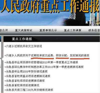 打開(kāi)麗江市、縣政務(wù)網(wǎng),記者發(fā)現(xiàn)永勝縣六德鄉(xiāng)政府一份看似不起眼的“通報(bào)”,該通報(bào)也是目前記者在麗江“網(wǎng)絡(luò)問(wèn)政”過(guò)程中發(fā)現(xiàn)的麗江市鄉(xiāng)級(jí)政府相關(guān)抗旱救災(zāi)款物流向通過(guò)政務(wù)網(wǎng)向社會(huì)公開(kāi)唯一鄉(xiāng)政府。