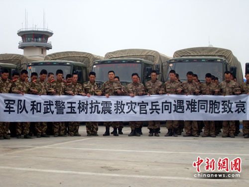 中新網(wǎng)4月21日電(劉洪星)今日,玉樹災(zāi)區(qū)巴塘機(jī)場武警青?傟(duì)第四支隊(duì)全體官兵、全體解放軍部隊(duì)、醫(yī)療單位、機(jī)場工作人員以及其他救援人員在候機(jī)樓前停車場舉行三分鐘默哀活動,現(xiàn)場降半旗,所有人員駐足默哀、所有車輛鳴笛、防空警報響起。同時玉樹州所有救援部隊(duì)、救援單位、各級人員同期舉行為地震死難人員默哀活動。
