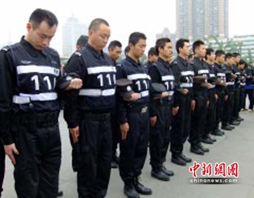 今晨,成都的上空被陰云籠罩,陰沉沉灰蒙蒙的天空使整座城市都沉浸在哀悼的氛圍當(dāng)中。上午10點(diǎn)許,成都市公安局青羊分局巡警大隊二十余名干警邁著整齊的步伐來到天府廣場,面對降下的半旗,向在這次地震中遇難的藏族同胞們默哀三分鐘。不少市民紛紛前往向遇難同胞默哀。
