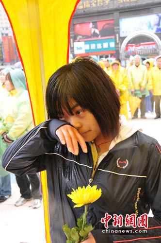 手持黃菊花的市民張女士表示,看到玉樹同胞遭受大災(zāi)難,她的心情特別的痛苦,尤其是有很多孩子沒有了父母,沒有了家庭。愿失去家園的孩子能早日重新走進(jìn)新的家園,希望玉樹的同胞重新站起來,重建美好家園。
