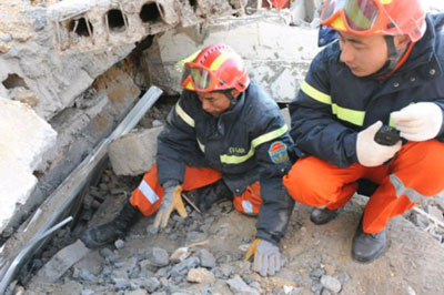 國(guó)家救援隊(duì)在到達(dá)玉樹(shù)機(jī)場(chǎng)后,救援隊(duì)員火速前往受災(zāi)最重的玉樹(shù)縣城結(jié)古鎮(zhèn)。全體救援隊(duì)員挑燈夜戰(zhàn),齊心協(xié)力營(yíng)救出2名幸存者。雖初戰(zhàn)告捷,但救援隊(duì)員不敢絲毫松懈,因?yàn)閺U墟還有更多生命等待我們。只要有一線希望,我們就會(huì)盡百倍努力,“不拋棄,不放棄”。