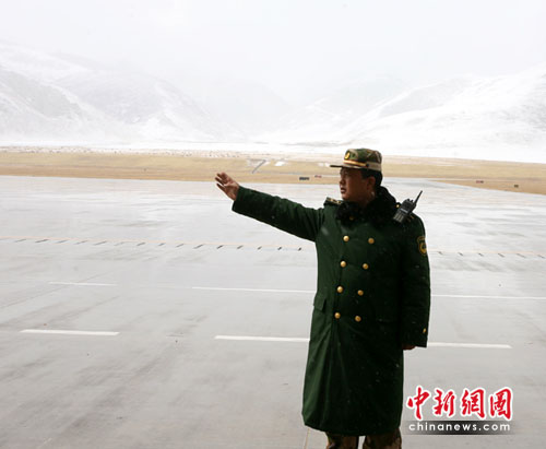中新網(wǎng)青海玉樹4月22日電(石磊記者劉忠俊)22日5:10分,青海玉樹災(zāi)區(qū)陰云密布,天空下起大雪。為確保唯一空中生命線的暢通,武警青?傟狇v巴塘機場官兵加強機場安全保衛(wèi)工作。