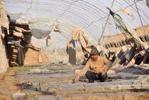 記者在恰特喀勒鄉(xiāng)設施農(nóng)業(yè)基地看到,大棚遭到大風不同程度的毀壞,棚頂?shù)乃芰媳∧と勘淮箫L吹爛,大棚內(nèi)的西紅柿、茄子等蔬菜被風沙侵襲后干枯,一些已經(jīng)掛果的蔬菜也大面積枯死。