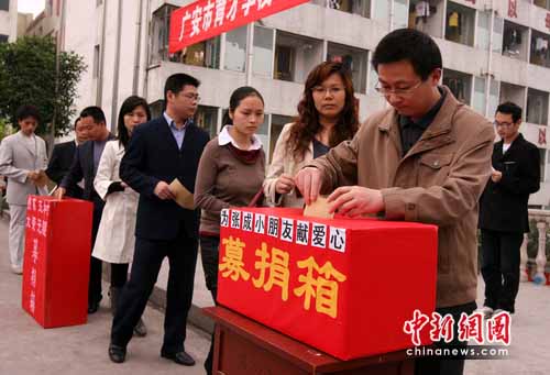 中新網(wǎng)成都4月26日電(廖小兵 王天青 曾一瑩)在“4.14”青海玉樹大地震中,四川廣安區(qū)龍安鄉(xiāng)文林村四組村民張朝清、聶文蘭夫婦雙雙遇難,留下遺孤張成與72歲的奶奶相依為命。消息傳來,愛心如潮,廣安區(qū)各界人士紛紛伸出援助之手。26日8時許,在廣安城南新區(qū)的育才學校校園內(nèi),師生們?yōu)榧娂娍犊饽,當場收到捐?5100.90元。
