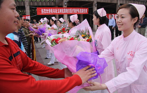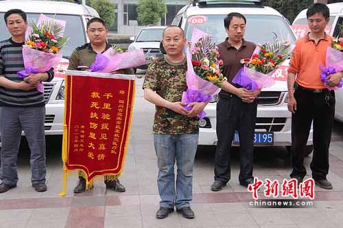 中新網(wǎng)成都4月30日電(蘭鋒)30日下午6時(shí)許,四川宜賓高速北站口,家鄉(xiāng)人民用鮮花和最熱烈的掌聲,歡迎圓滿完成青海玉樹抗震救災(zāi)任務(wù)的宜賓醫(yī)療救護(hù)隊(duì)凱旋。