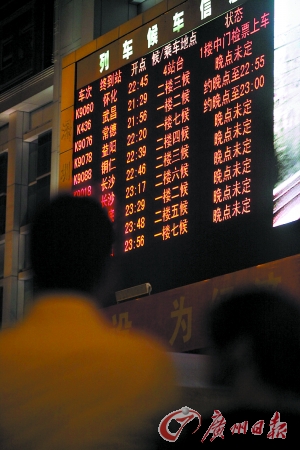 昨晚9時經緊急搶修中斷行車3小時的京廣線重新恢復通車。受此影響,當晚7時后從廣州火車站發(fā)出的列車出現(xiàn)晚點,滯留旅客一度擠滿候車大廳。