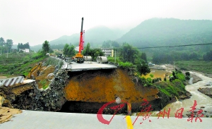 本報(bào)韶關(guān)訊(記者卜瑜 通訊員賴志坡、蔡明清攝影報(bào)道) 位于乳源境內(nèi)的國道323線K426+360處大型涵洞被洪水沖毀。路面出現(xiàn)深達(dá)14.5米的大洞(如圖),被毀路基長90米、路面面積1000平方米,交通中斷。韶關(guān)市政府昨天調(diào)集100多名工人和10多臺大型機(jī)械日夜搶修,有望今天恢復(fù)通行。