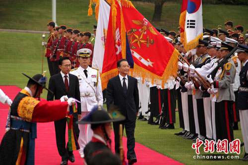 會談前,李明博為溫家寶舉行了歡迎儀式。