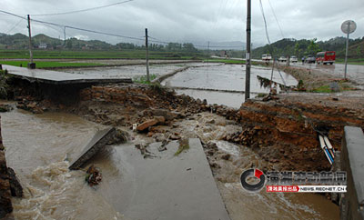 該路毀壞最嚴(yán)重的地方位于李熙橋段,因山體滑坡,路基被水沖空。在該路段的兩端,均設(shè)有“水毀道路,繞道行車”的指示牌。