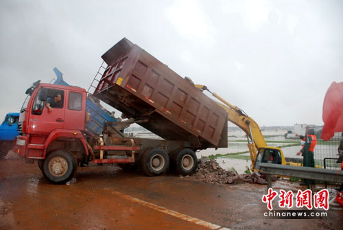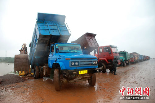 中新網(wǎng)臨川6月24日電(張見悅 劉占昆 何柳斌)江西撫河唱凱段數(shù)百米米決口封堵方案已經(jīng)確定,24日中午,記者在福銀高速撫河大橋看到,大批工程車輛運(yùn)載石料,準(zhǔn)備鋪就一條運(yùn)輸通道延伸向決口初,決口封堵的外圍工程在雨中開始緊張進(jìn)行。