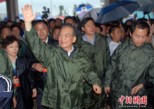 當(dāng)日上午,溫家寶冒雨深入重災(zāi)區(qū)撫州羅針鎮(zhèn),察看汛情、災(zāi)情,看望受災(zāi)群眾,慰問奮戰(zhàn)在抗洪搶險(xiǎn)一線的解放軍、武警、公安消防官兵。