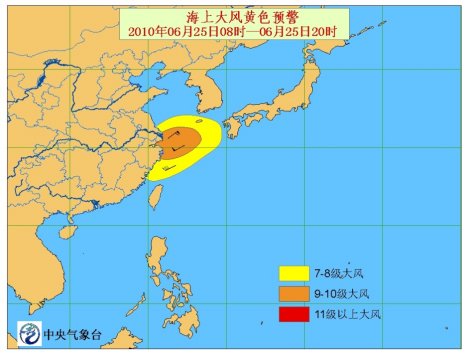 中新網6月25日電 中央氣象臺6月25日06時繼續(xù)發(fā)布海上大風黃色預警:受入海氣旋影響, 25日08時至20時,東海北部海域將有8~9級大風,陣風可達10~11級。另外,東海南部海域將有7~8級、陣風9級的西南風;黃海南部海域將有7~8級、陣風9級的東北風。