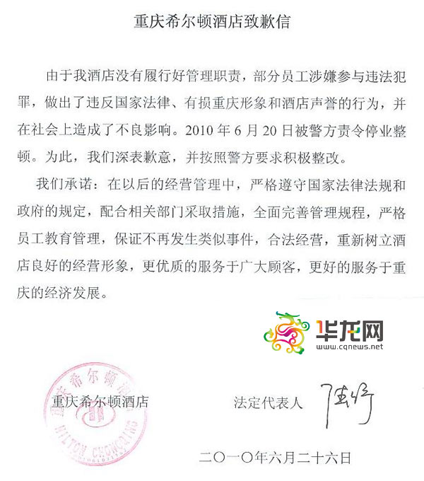 2010年6月20日,重慶希爾頓酒店因股東涉黑,介紹、容留婦女賣淫,違法經(jīng)營和故意擾亂社會秩序,被重慶警方責令停業(yè)整頓。今日16時40分,重慶希爾頓酒店法定代表人陸紓,通過華龍網(wǎng)記者就此事公開發(fā)表致歉信,承諾合法經(jīng)營,更好地服務重慶經(jīng)濟發(fā)展。