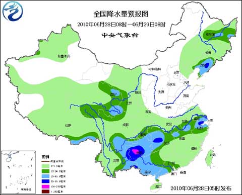 6月28日至29日,江南中北部、西南地區(qū)東部將有5~25毫米降雨,局部地區(qū)有30~60毫米,東北地區(qū)有3~15毫米、局部地區(qū)20~25毫米的陣雨或雷雨;