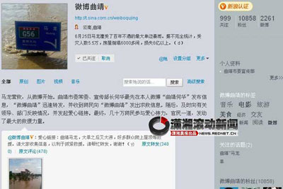25日晚,云南省曲靖市馬龍縣遭遇特大暴雨,26日中午起,曲靖市委宣傳部部長何華的個人微博及宣傳部官方微博——“微博曲靖”開始圖文直播馬龍災(zāi)情與救災(zāi)情況,在馬龍縣城電力、交通、通訊中斷幾成“孤島”的情況下,曲靖官方微博成為網(wǎng)友獲取第一手信息的來源。