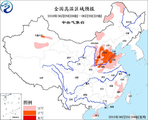 中新網(wǎng)6月29日電 中央氣象臺(tái)29日06時(shí)繼續(xù)發(fā)布高溫藍(lán)色預(yù)警:預(yù)計(jì),今天白天,內(nèi)蒙古東北部和中部的部分地區(qū)、黑龍江西北部、山西大部、河北大部、天津、河南大部、山東大部、安徽北部、江蘇西北部、福建北部和南部的部分地區(qū)、江西東北部的部分地區(qū)、海南北部等地有35~37℃、部分地區(qū)38℃的高溫天氣,其中,河北南部的局部地區(qū)氣溫可達(dá)40℃。
