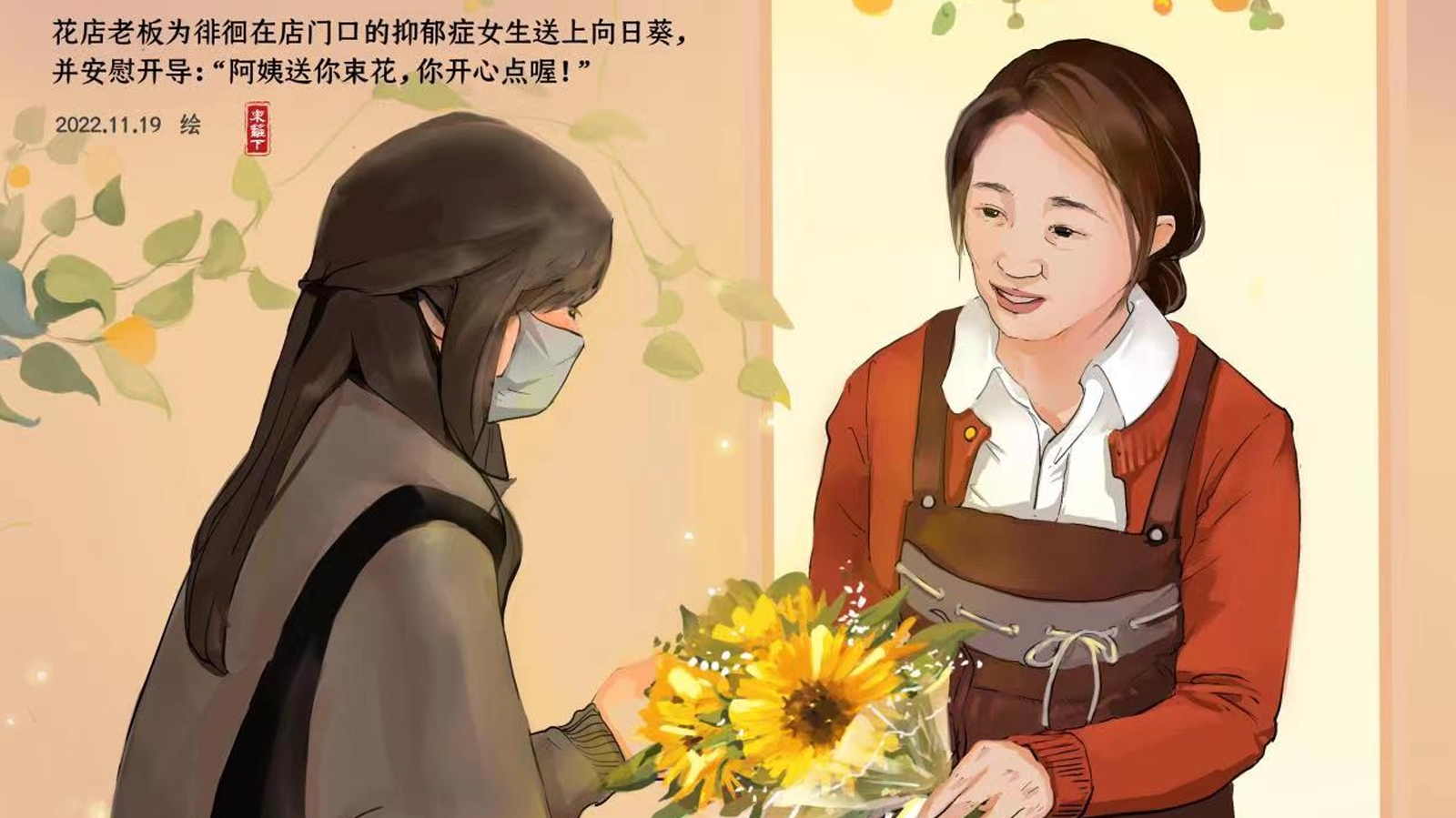 近日,廣西百色一名患抑郁癥的初中女生在一家花店門口徘徊,花店老板了解到情況后,主動(dòng)給女孩送了一束向日葵并安慰開導(dǎo)。