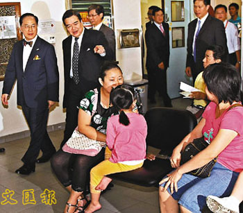 曾蔭權在香港食物及衛(wèi)生局局長周一岳和醫(yī)院管理局主席胡定旭的陪同下,22日巡視油麻地賽馬會分科診所,并慰問正接受體檢的家長及兒童。