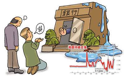 銀行“水浸”卻未能令拆息回落,3個(gè)月拆息仍高漲在2厘水平。金管局發(fā)言人表示,由于美元長(zhǎng)倉(cāng)平盤令港元匯價(jià)偏強(qiáng),令該局被動(dòng)沽出港元。雖然港匯持續(xù)強(qiáng)勢(shì),但強(qiáng)調(diào)現(xiàn)行聯(lián)匯制度行的有效,無意改變目前的兌換范圍,或擴(kuò)大兌換的浮動(dòng)區(qū)間。