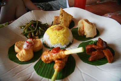 除去烤乳豬之外,多數(shù)的料理都先把材料剁或搗得細碎,特別是慶典中的必借菜色:蒸什錦(lawar)、沙嗲串烤(sate)和以芭蕉葉包裹的蒸肉丸(tum)。