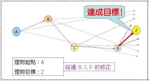 經(jīng)過一段時間,理財階段來到了C點,似乎又偏離了當(dāng)初既定的方向。就又是“適時調(diào)整”的時候,所以重新找出新方向,即從C點至Z點的雙箭頭所涵蓋的范圍。在投資理財?shù)倪^程中,會不斷的重復(fù)B點、C點、D點等的修訂調(diào)整。