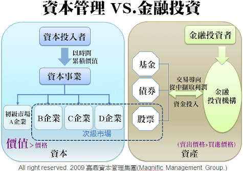 資本管理則是截然不同的取向。資本管理的焦點(diǎn),在于“事業(yè)”(或是企業(yè))上,資本投入者的眼光和視野,完全著重在:“這個(gè)企業(yè)容易理解嗎”、“我能否掌握它的長期經(jīng)濟(jì)特質(zhì)”、“管解階層正直可信嗎”,并透過合理價(jià)格,取得企業(yè)一部分的未來。