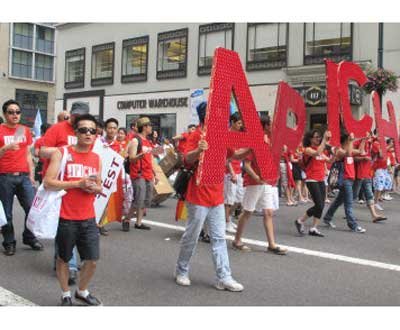 亞裔隊(duì)伍由巨大的彩虹字幅“Asian Pride”打頭陣,數(shù)十人演奏亞洲樂器,吸引民眾注意力,緊隨其后的是專門為亞裔女同志設(shè)立的Q-Wave團(tuán)體。“亞太裔艾滋病聯(lián)盟”(APICHA)主打“免費(fèi)HIV檢測”計(jì)劃,近百位身穿紅色T恤的成員們手舉標(biāo)語,向沿路民眾分發(fā)安全套。