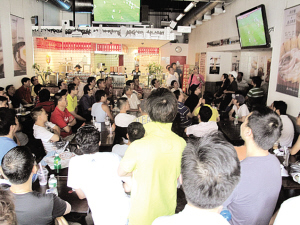 在南非世界杯舉辦期間,紐約華埠和小意大利區(qū)均沾著世界杯的喜氣,不少餐館、酒吧都在比賽時(shí)播放賽事,門(mén)外還有黑板寫(xiě)上比賽兩隊(duì)介紹!跋愀壅尽笨觳偷晔侨A埠餐飲業(yè)首先這樣做的,餐館內(nèi)張貼了告示:“最低消費(fèi)4.25元,開(kāi)賽前30分鐘至散場(chǎng)。”球迷都說(shuō)值,因此每場(chǎng)賽事均座無(wú)虛席。11日荷蘭與西班牙爭(zhēng)桂冠,更加吸引球迷及準(zhǔn)球迷,餐廳內(nèi)爆滿,有的站在門(mén)外隔著玻璃看賽事,也感到過(guò)癮。