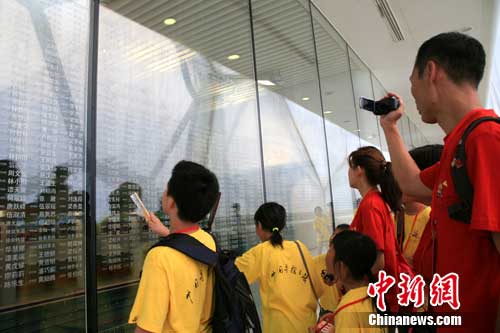 27日下午,參加“2010年海外華裔及港澳臺地區(qū)青少年‘中國尋根之旅’夏令營”的6000余名華裔青少年一同參觀了“鳥巢”和“水立方”。他們中很多營員的父母或親朋好友曾為“水立方”的建設(shè)捐款,姓名被刻在“水立方”的留名廊上。