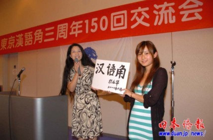交流會(huì)上展示了中國(guó)駐日大使程永華揮毫題寫的“漢語(yǔ)角”3個(gè)大字,顯示了中國(guó)駐日大使館對(duì)中日民間交流的重視和對(duì)舉辦漢語(yǔ)角的支持。
