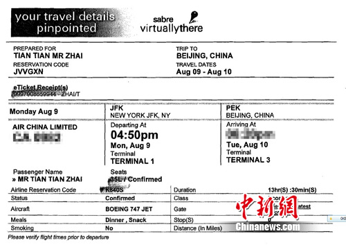 據(jù)了解,翟田田所乘坐的從紐約肯尼迪國(guó)際機(jī)場(chǎng)直飛中國(guó)北京的航班,將于10日下午抵達(dá)北京,屆時(shí)翟田田的親友將在北京接機(jī)。(完)