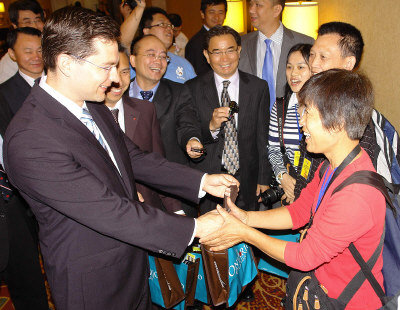 在與杜江等人會(huì)晤后,柏利文也代表哈珀總理,向首發(fā)團(tuán)廣東中旅團(tuán)員致贈(zèng)紀(jì)念品,并一一握手問好、寒暄與交談。
