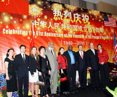 楊國強在致辭中回顧了中國建國61年來取得的重大成就。他說,中國保持持續(xù)、健康、快速發(fā)展的良好勢頭,經(jīng)濟社會各項事業(yè)穩(wěn)步推進(jìn),綜合國力不斷增強,國際地位日益提高。中美互利合作的友好關(guān)系為美國中西部和中國提供了巨大的機會。到去年底,有70個中國公司來到美國中西部開展業(yè)務(wù),投入近三億美元。在中西部,大約有三萬名學(xué)生現(xiàn)在學(xué)習(xí)中文,這里已經(jīng)建立了15所孔子學(xué)院供人們學(xué)習(xí)中國文化和語言。