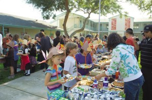 南帕沙迪納一家小學(xué),為2年級的孩子們準(zhǔn)備了豐富的“感恩大餐”。圖為家長與老師配合,給孩子送上美味的食品。(美國《僑報》/蔚宇 攝)