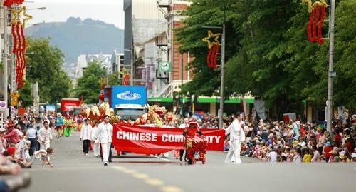 在醒目的“中華社區(qū)”英文橫幅后面,是幅面巨大的五星紅旗和新西蘭國(guó)旗。兩面旗幟都是3米寬5米長(zhǎng),合計(jì)面積達(dá)到30平方米,需要12個(gè)人共同擎舉,極為引人注目。華人隊(duì)伍聲勢(shì)浩大,鑼鼓喧天,紅旗招展,觀眾們看到隊(duì)伍過(guò)來(lái),遠(yuǎn)遠(yuǎn)就開(kāi)始熱情鼓掌歡迎,主持人還組織觀眾學(xué)著用中文齊聲高喊:“你好!”形成一股巨大的聲浪,向中華社區(qū)方陣致意,向基督城華人問(wèn)好。